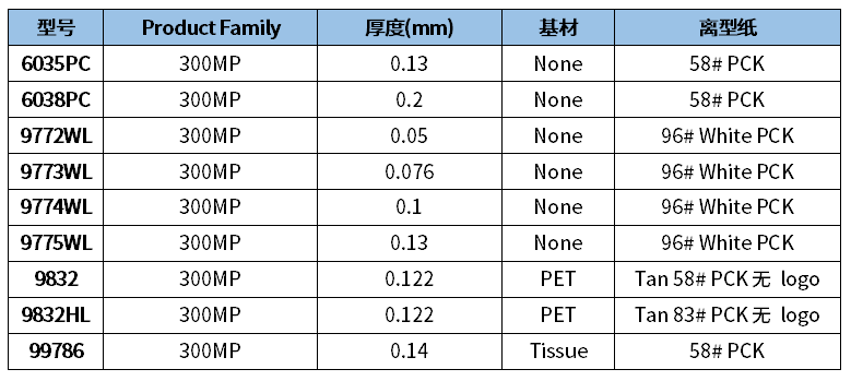 其次,300MP胶系全系列包括纯胶膜、双面PET基材胶带,以及广大用户喜欢的无纺布基材胶带。而300LSE只有纯胶膜和PET基材胶带,没有无纺布系列。